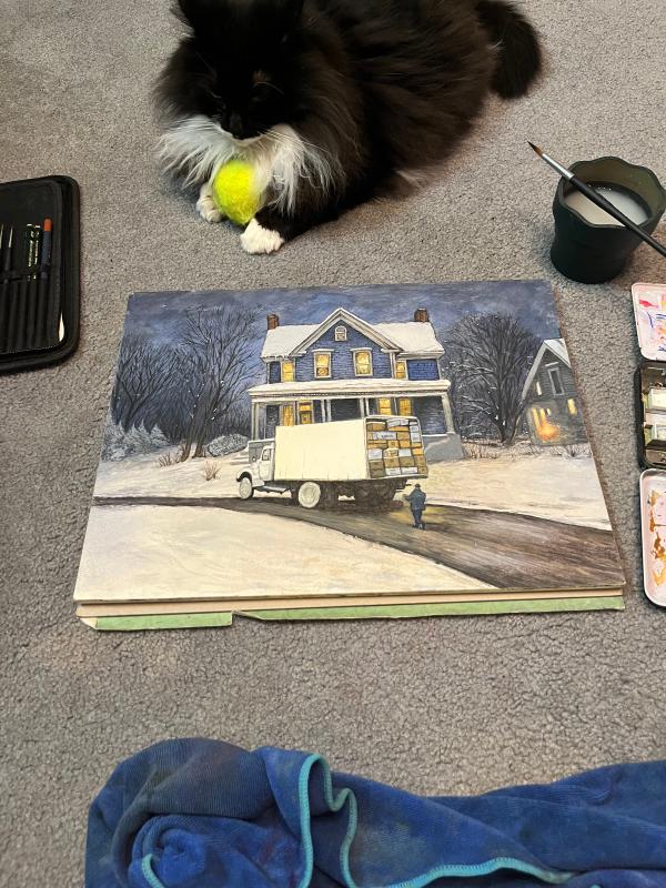 Based on December 22nd, 2020: Fruitcake Delivery is just in time for the upcoming holidays, this quaint winter scene showcases a Fruitcake delivery truck and it’s driver preparing to drop off it’s abundant order of 30 fruitcakes to the anxiously awaiting recipient in the blue snow covered house. A wasteful purchase that would later go on to be donated to the local food bank, with an absurd and humorous smile. The package handler’s confident movements inferring that him and homeowner inside are intertwined in scandalous love affair. The glow of light from the windows adds to the charm of the painting. The neighbor’s house seems set in but yet still glowing with life. As is with the main focus of the blue house with white trim, with it’s windows inviting a sense of warmness away from the cold wind. The calmness of the winter night should be heard in mind. It’s left up to the viewer to form their own opinions of what the delivery figure may be thinking or what will transpire when the door bell rings.