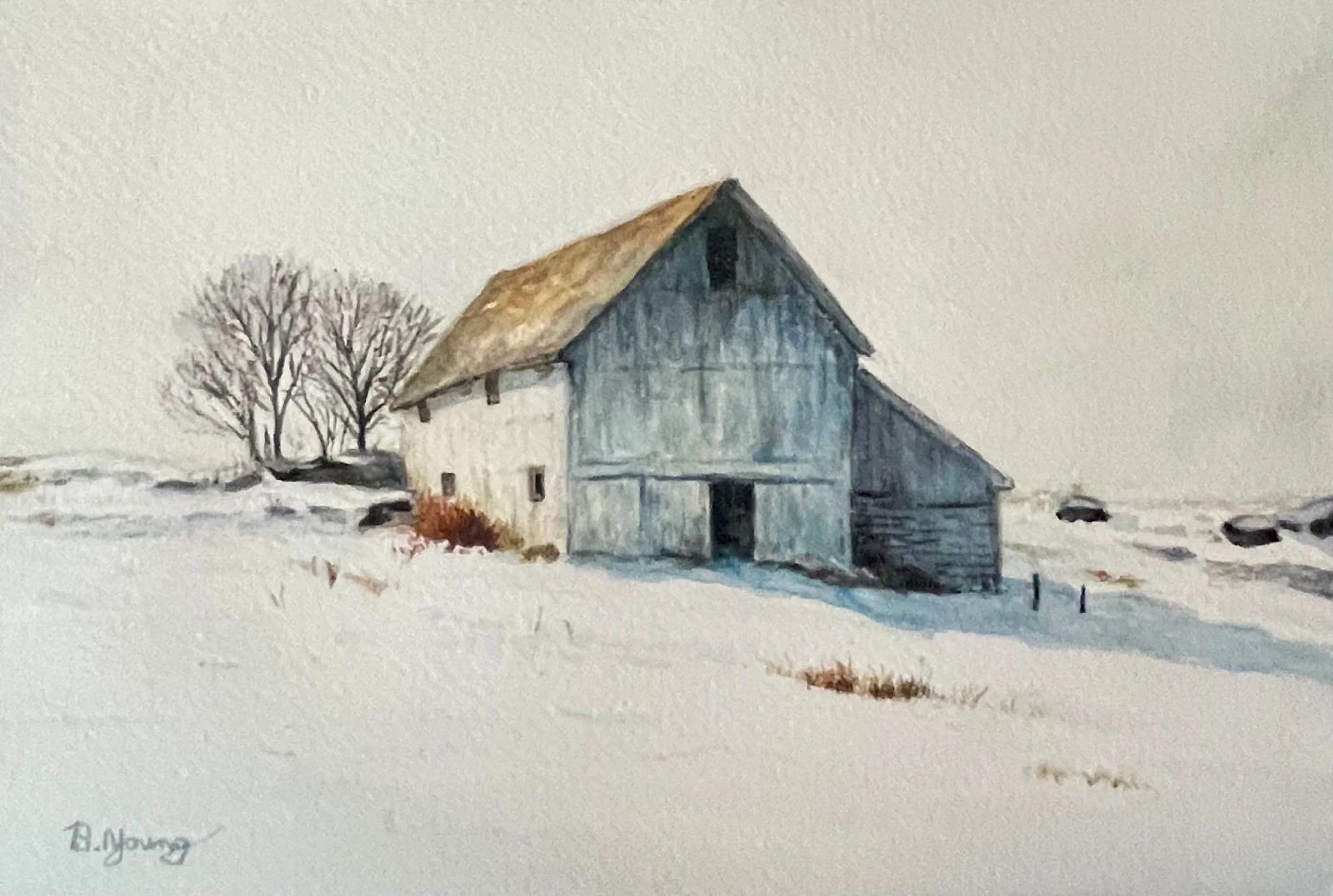 A quiet winter morning unfolds in this original watercolor, where a solitary barn rests beneath a pale sky and fresh snow softens the land. The scene feels unhurried and still, as if the world has paused for a moment of breath. Cool blue shadows drift across the snow while the weathered barn stands steady, carrying traces of warmth and history against the cold.