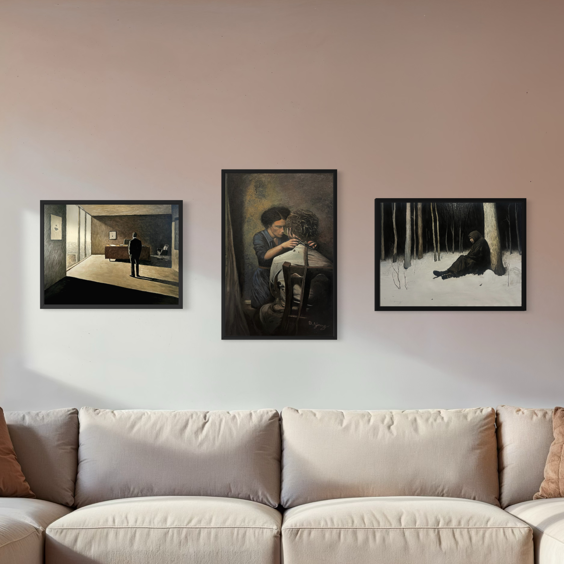 Following the loss, the work descends into a prolonged season of grief. This era reflects the weight of PTSD, suppressed emotion, and the internal isolation that defined those years. The brushwork becomes heavier, the palette more restrained, and the emotional tone more introspective. It is not simply sadness, but survival — art created while navigating the long shadow of trauma.